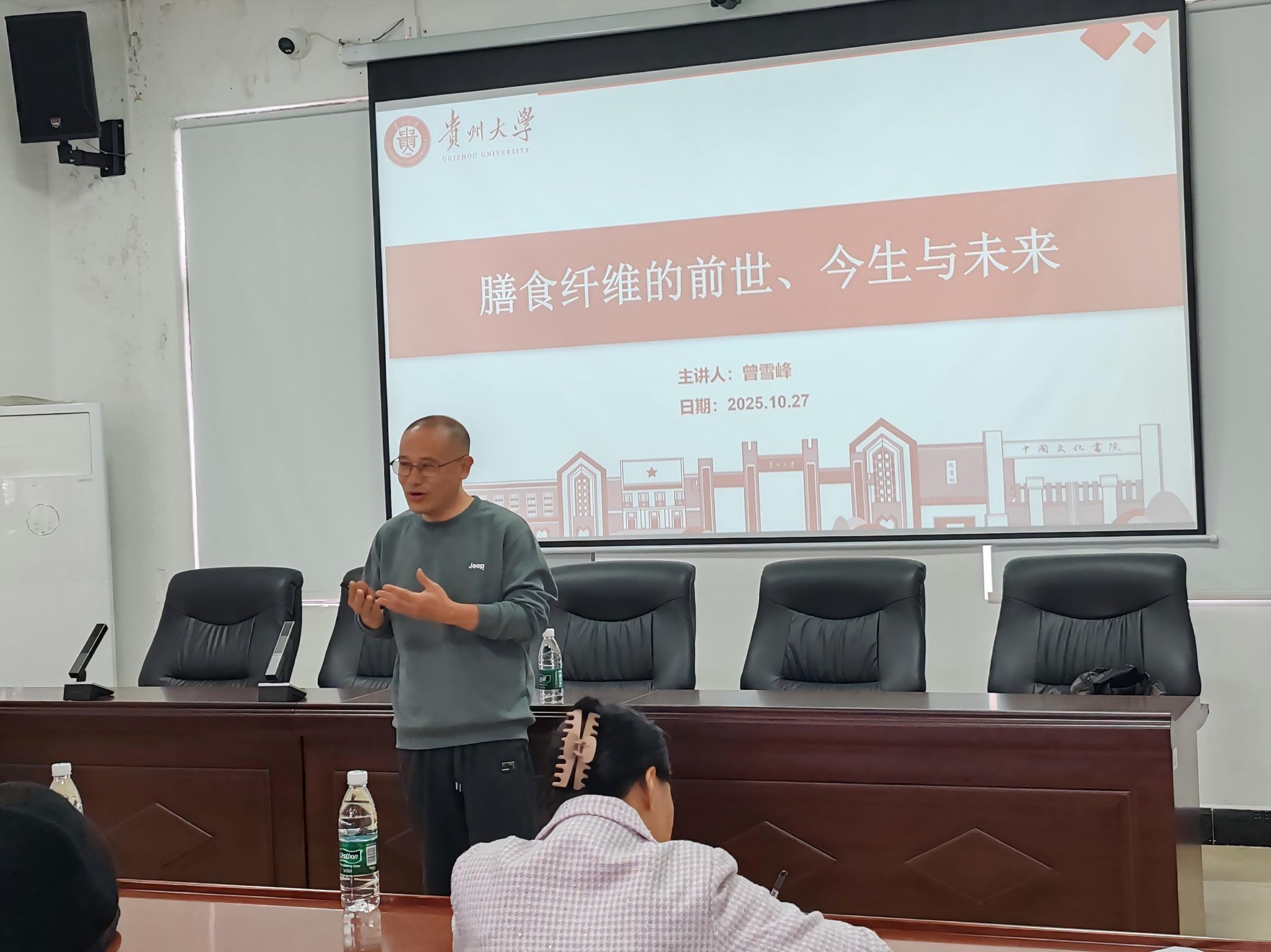 曾雪峰教授是食品科学领域资深学者,主持多项国家级、省级科研项目,发表SCI论文60余篇,其中中科院1区38篇,科研经验丰富。在营养科学的浩瀚星空中,膳食纤维是一颗既传统又充满未来感的星辰。此次会议围绕膳食纤维的三维度展开 :(一) 前世:解析膳食纤维从“无营养杂质”到被关注的认知历程,结合粮油副产物案例说明其在传统饮食中的隐性作用。(二)今生:阐述其调节肠道微生态、控血糖血脂、辅助体重管理等健康价值,介绍通过发酵改性等工艺提升其利用率的研究。(三)未来:展望其在医药载体、可降解材料、精准营养等跨界应用,分享从米糠、豆渣中提取功能性膳食纤维的技术突破。  这次讲座不仅是膳食纤维的“历史复盘”与“未来展望”,更是一次食品科学与营养健康的跨界对话。曾教授的讲座为我校食品、营养相关学科发展提供方向参考,也有利于学科跨界创新。