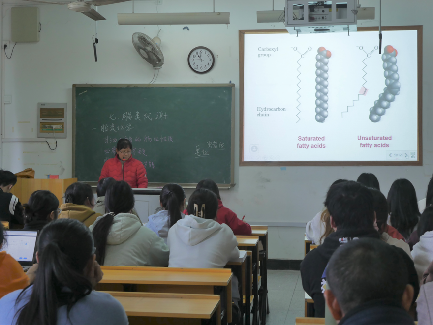 课堂伊始,孙老师以生动形象的语言带领同学们走进食品中重要的生物化学成分——脂类的世界,围绕脂类化学及其代谢展开系统教学。课程内容紧扣“夯实基础、关联应用、服务成长”的课堂革命目标,从四大核心维度层层递进:一是聚焦脂类主要种类甘油三酯,解析其关键物理化学性质,点明其与大三专业课中食品加工工艺、化学知识的紧密关联;二是重点讲解必需脂肪酸,为后续食品营养学学习铺垫核心知识点;三是解读皂化值、碘值等与脂类不饱和性相关的指标,阐明其对脂类加工性能的影响;四是梳理脂类的生理功能,深入剖析脂肪酸氧化与合成等代谢过程,构建完整的知识体系。