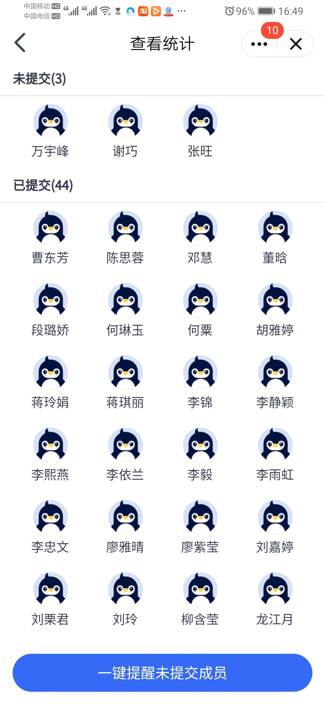 在学生在QQ小程序“老师助手”上提交作业后,老师对学生提交作业情况进行检查并督促学生及时完成网课学习。以刚结束的第六周的课程为例,我在作业提交截止之后,通过“老师助手”软件掌握的2018级生物科学1班、生物科学2班提交作业总体情况,通过查看统计,找到未提交作业的同学。