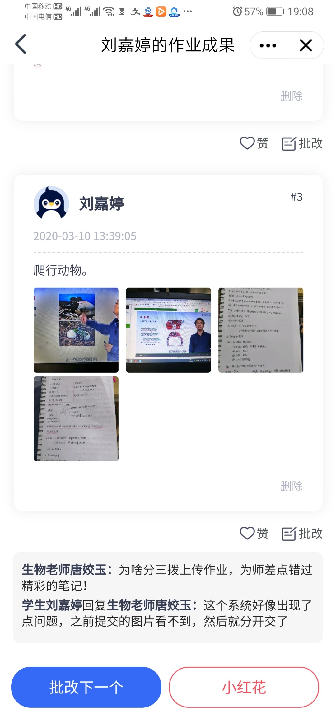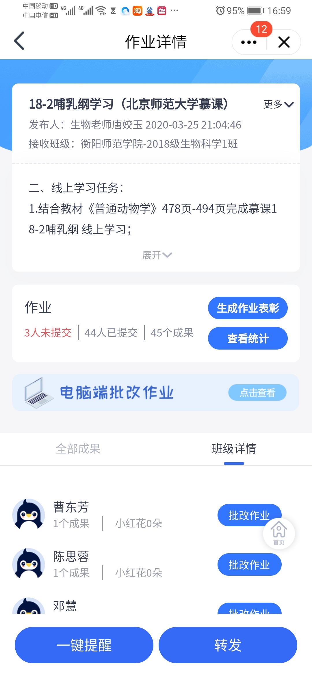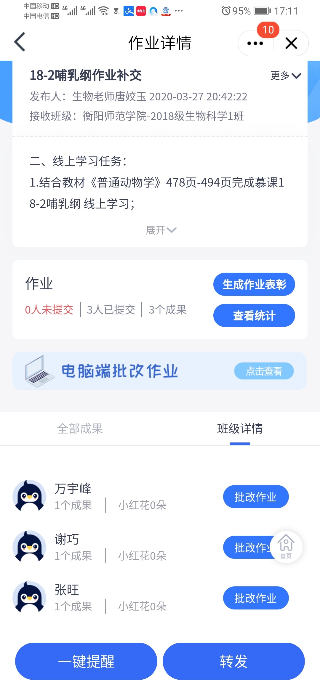 在开课的前一天通过QQ小程序“老师助手”、QQ群发布线下作业,线下作业包括书本上的思考题和老师布置的巩固性练习题。以第4周星期二慕课16-1、16-2爬行纲学习为例,我们的线下作业情况如下: