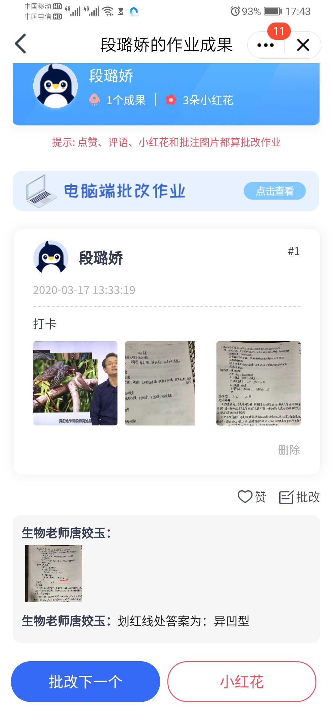 学生作业交齐后,我再对学生的作业情况进行检查,进行批改和批注。下面2图为学生作业及教师批注随机截屏2例。
