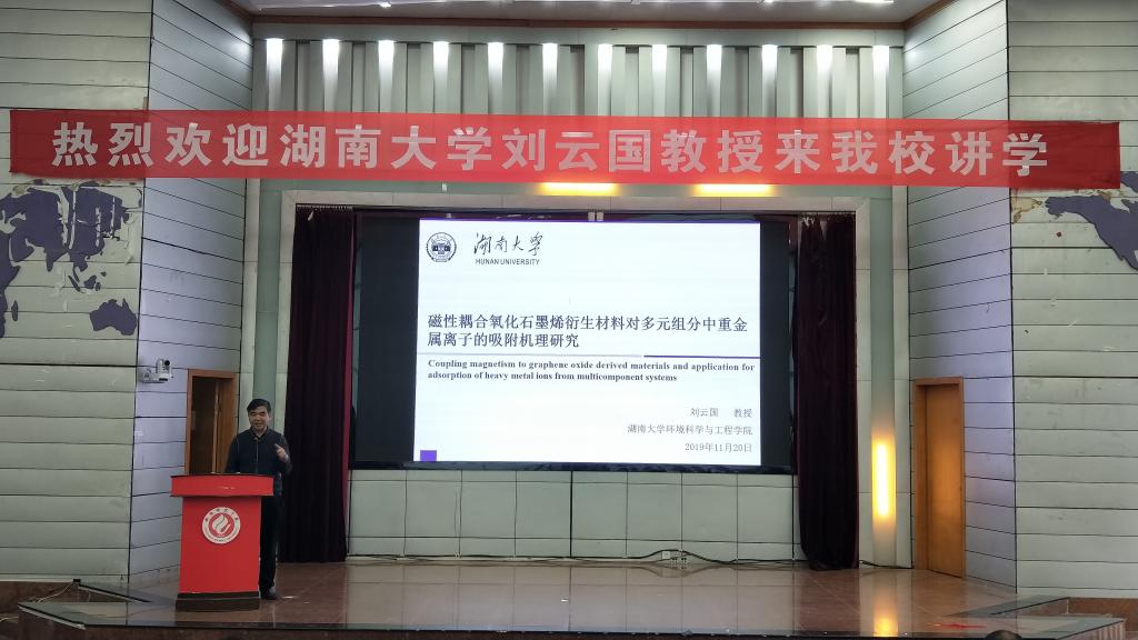 为营造良好的校园学术氛围,加强学科建设,促进学术交流,11月20日下午四点二十,买球官网特邀湖南大学环境科学与工程学院刘云国教授在西校区学术报告厅做了题为“环境科学与工程研究思路与方法探讨”的学术报告。报告会由生命科学与环境学院院长曹丽敏主持,彭晖书记,易诚、杨海副院长,黄斌艳、罗远来老师及师生代表约200余人聆听了本次讲座。
