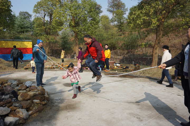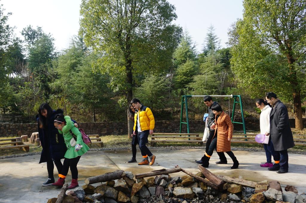 上午10点,久违的暖阳透过云层洒向大地,老师们抵达山庄,沿路观赏山庄独特的风光,呼吸新鲜空气,与大自然来一次亲密的接触。寻得一块空地,大家聚在一起开展趣味活动。在考验默契度的“横行天下”比赛中,或者同事,或者亲子,两两捆绑,踩着相同的节奏,踏出一致的步伐。接着,老师们一个接一个在绳之间跳跃,身手敏捷,好不快乐。在运动中的他们个个露着开心的笑容,“两个,四个……”脚下的气球一个接一个的爆炸,大家沉浸在“踩气球”游戏中,畅快无比。