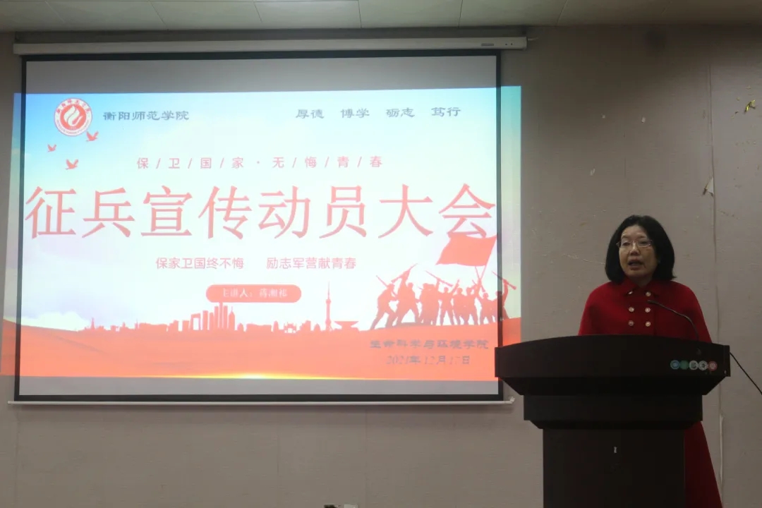 会议第三项,学院党总支副书记蒋湘祁作动员讲话。首先,蒋书记向大家介绍了学院2021年征兵工作完成情况。其后,蒋书记指出应征入伍是当代青年大学生的光荣和应负责任。大学生入伍是新形势下提高部队兵员素质、加强国防和军队现代化建设的重大举措。它不仅有利于加速部队现代化建设,又充分体现了党和政府对在校大学生的爱心和爱护,满足大学生携笔从戎、报效祖国、献身国防的夙愿。大学生到部队后,能够得到全面的锻炼和提高,有利于大学生全面成长。同时,对学校的校风校纪建设也有一定的促进作用。最后,蒋书记解读了大学生在大学期间参军入伍的优惠政策,鼓励生环学子参军入伍。