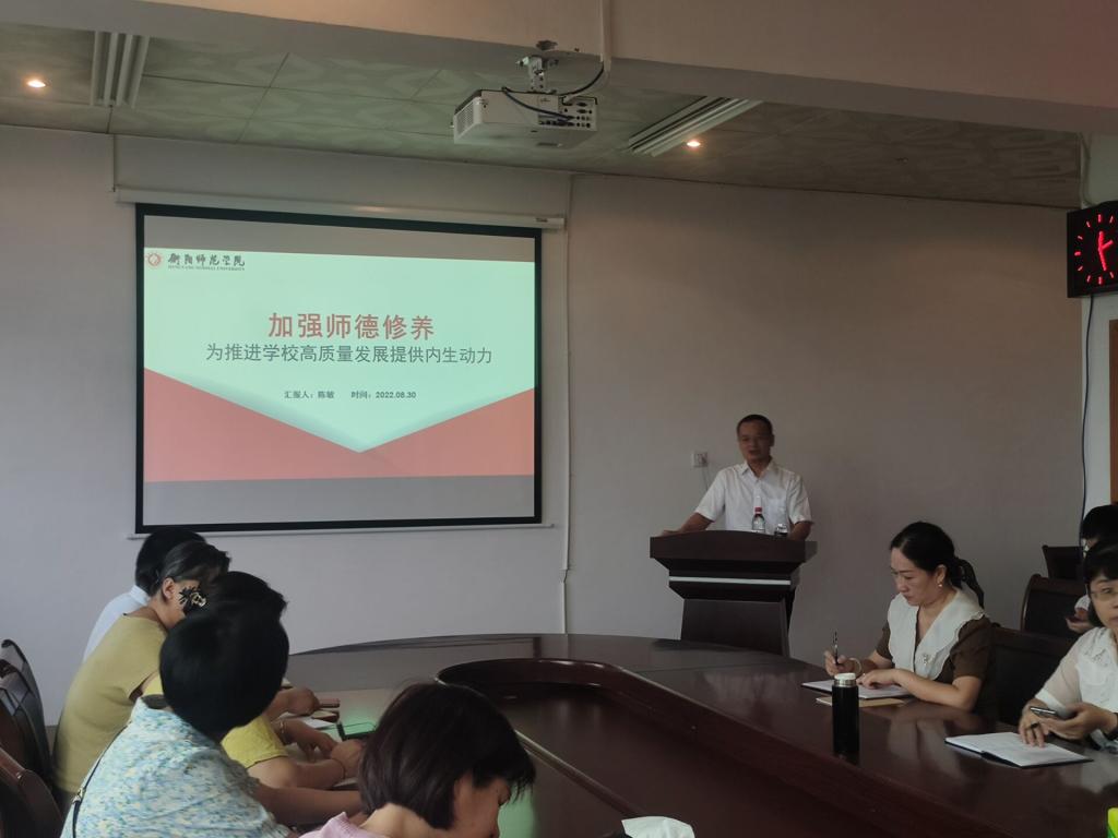 8月30日上午,陈敏副校长为全院教师做关于《加强师德修养——为推进学校高质量发展提供内生动力》的报告,陈校长的党课具有理论高度、认识深度,要求买球官网全体教师要做好师德师风表率,推动学校高质量发展。紧随陈校长步伐,曹书记接下来做了《深入学习践行<新时代高校教师职业行为十项准则>》的报告,老师们纷纷表示要继续立足教书育人本职工作,做好学生的引路人。