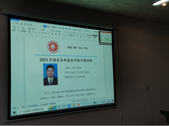 上海交通大学医学院附属瑞金医院普外科、胰腺疾病研究所符达研究员于2022年11月30日16:00通过腾讯会议的网络平台对买球官方网站教师进行了国家自科基金申报专题讲座。讲座内容涉及国家自然科学基金申报现状、申请前的准备与思路整理、基金写作的总体要求、指导与评审体会等方面。