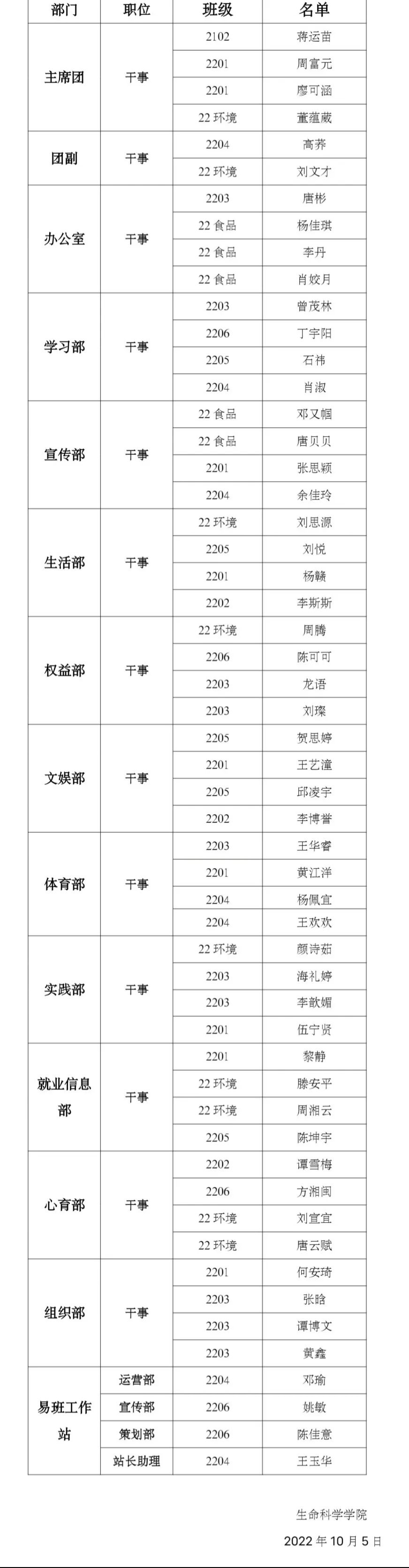 经个人竞演、学院选拔、团委讨论决定,拟招以下同学为第十五届团委学生分会主席团干事及各部门干事,现将考察名单予以公示。公示时间为10月5日-10月10日,欢迎全院师生反映公示对象存在的问题。(反映问题请联系QQ:2280310193,届时考察小组将对反映问题进行核实并做出答复)