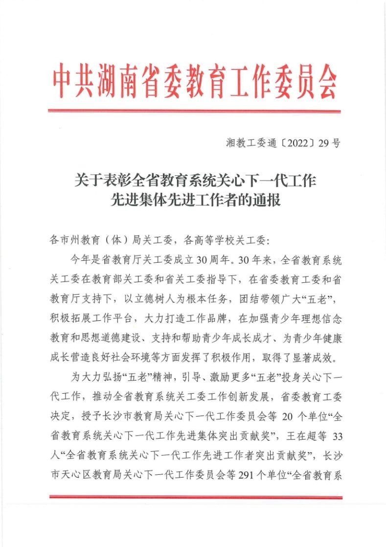 近日,省委教育工委印发了《关于表彰全省教育系统关心下一代工作先进集体先进工作者的通报》,买球官网荣获“全省教育系统关心下一代工作先进集体”荣誉称号。