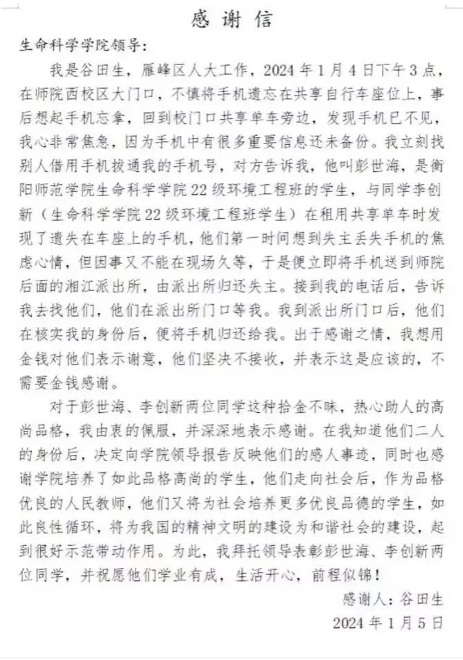 2024年1月4日下午3点,雁峰区人大工作的谷先生不慎将手机遗忘在买球官方网站西校区门口的共享自行车座位上,手机中有很多未备份的重要信息,谷先生借用他人手机拨通自己电话后得知,是我校买球官方网站22级环境工程班的彭世海同学和李创新同学捡到了手机,并且已经将手机交于湘江派出所。谷先生在派出所门口见到这两名同学后,想用金钱表达感谢之情,但他们坚决不肯收下,并表示这是应该做的。