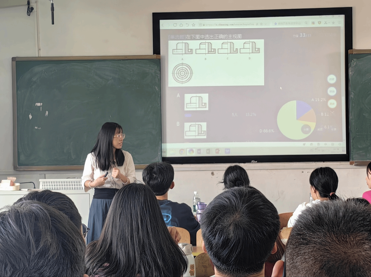 王晶老师借助多媒体教学系统讲授 “环境工程制图与CAD”课程,她从物体的形体表达入手,讲述了几种常用视图:基本视图、向视图、局部视图、斜视图、剖视图以及这些视图的制作依据。王老师表示:数字化技术是制图技术的基础,同学们想领略环境工程设计中图形语言的魅力,就必须认真学好制图软件的操作,从数字设计方面来把握图形,只有这样,我们才能够准确、清晰地通过图纸来表达工程构思。