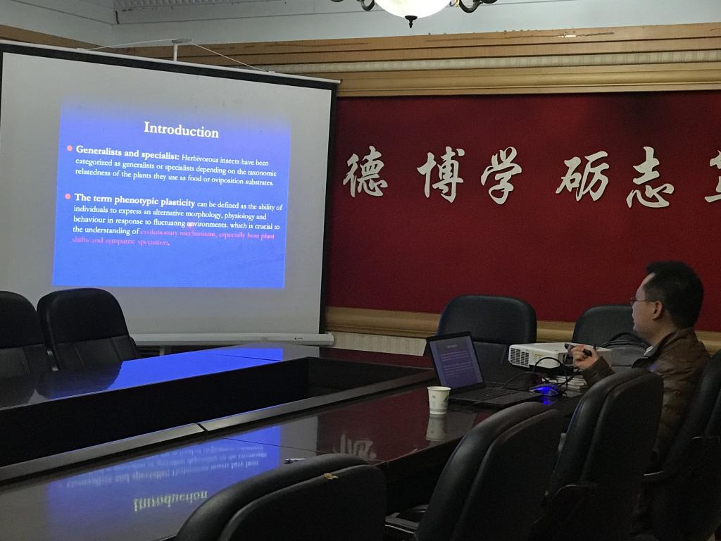 周博士首先介绍了他实验选取的对象及实验的目的,他选取棉铃虫和烟青虫作为实验动物,棉铃虫是广食性昆虫,而其近缘种昆虫烟青虫是寡食性昆虫。他使用这两种昆虫幼虫和三种植物(烟草、棉花和辣椒)来研究不同取食经历对于昆虫取食偏好的影响,从而比对出哪一种幼虫体现出了更强的味觉可塑性。接着周博士详细生动地介绍了他研究的具体过程和具体分组情况,实验结果表明,寄主植物的取食经历影响了这两种昆虫幼虫后续的取食选择,当面临更多选择的时候,相比烟青虫幼虫而言,棉铃虫幼虫体现出了更强的可塑性。