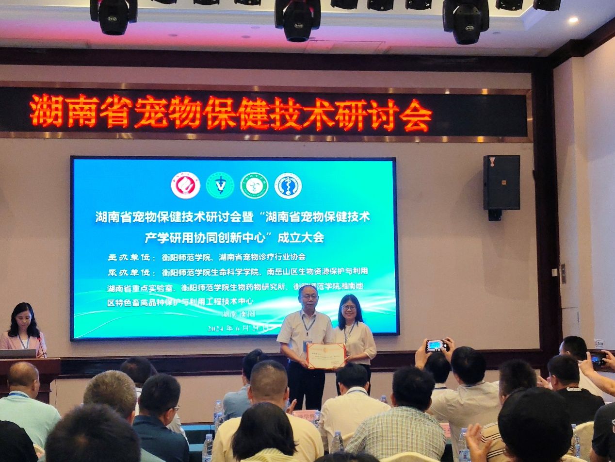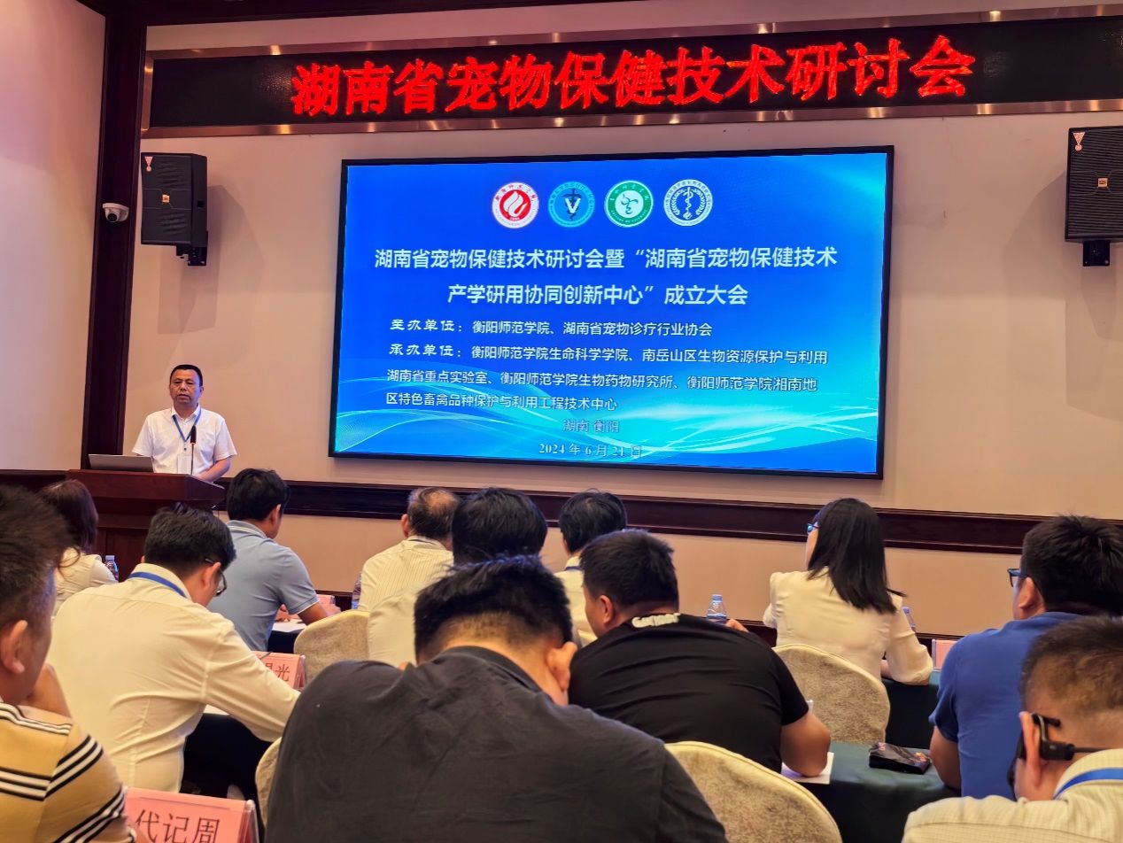 湖南省宠物保健技术研讨会暨“湖南省宠物保健技术产学研用协同创新中心”成立大会于2024年6月21日在衡阳市召开。本次会议由买球官方网站和湖南省宠物诊疗行业协会联合主办,由买球官方网站、南岳山区生物资源保护与利用湖南省重点实验室和买球官方网站生物药物研究所、买球官方网站湘南地区特色畜禽品种保护与利用工程技术中心联合承办。湖南省宠物诊疗行业协会会长钟学辉、秘书长胡锡光、副会长袁焕新、副会长赵道贵、衡阳市畜牧水产事务中心副主任曾繁荣、买球官方网站科研处处长邓运员教授、买球官方网站合作发展与校友联络中心主任陈梅香、买球官方网站现代教育发展学院院长唐斯萍教授、买球官方网站院长易诚教授、副院长杨海教授、副院长陈晓华博士、南岳山区生物资源保护与利用湖南省重点实验室常务副主任唐青海教授及湖南省宠物医疗、保健、食品行业的专家、行业企业代表及高校师生参加了本次会议。