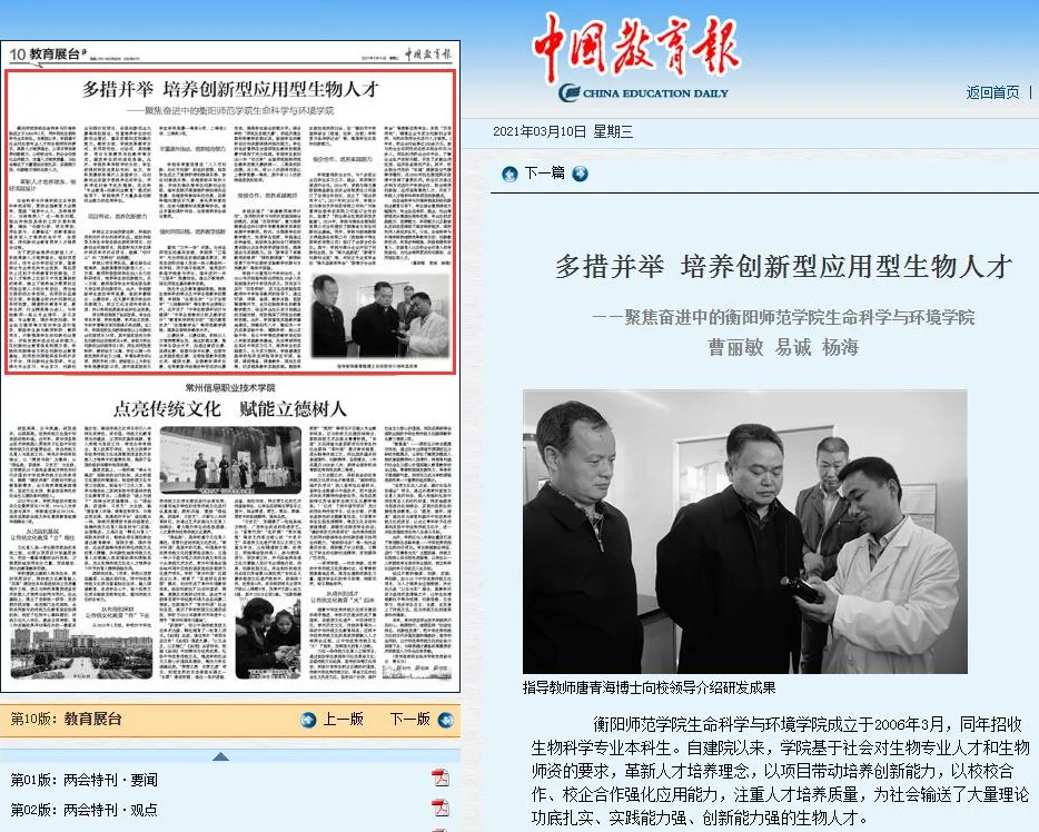 3.深化课程教学改革,为学科专业发展提供着力点根据师范专业认证的需要,从课程建设入手,建立以学生为主体、以成果为导向的专业教学改革模式。着重培养学生的思想政治、专业知识及实践操作技能,构建“品德-知识-能力”三位一体的人才培养模式,加大教育教学研究及精品课程建设,加强学生综合素质的培养,为学生的可持续发展及毕业就业提供保障。依托持续建设的生物科学重点实验室,突出细胞生物学、分子生物学等前沿技术,通过生物技术在食品、农业、环境各领域的应用,服务地方经济,利用校校合作、校企合作、校地合作,促进大生物学科的建设。学院基于社会对生物专业人才和生物师资的要求,革新人才培养理念,以项目带动培养创新能力,以校校合作、校企合作强化应用能力,注重人才培养质量,为社会输送了大量理论功底扎实、实践能力强、创新能力强的生物人才,并产生较大影响,2021年学院生物科学专业获批国家级一流本科专业建设点。近5年,学院教师共主持省部级以上教研项目21项,发表教研论文26篇,获湖南省教育成果二等奖1项,湖南省一流本科课程4门、省级精品在线开放课程1门。学院正在形成以教学成果为导向,以教学研究为抓手、以课程建设为基础的教学改革格局。