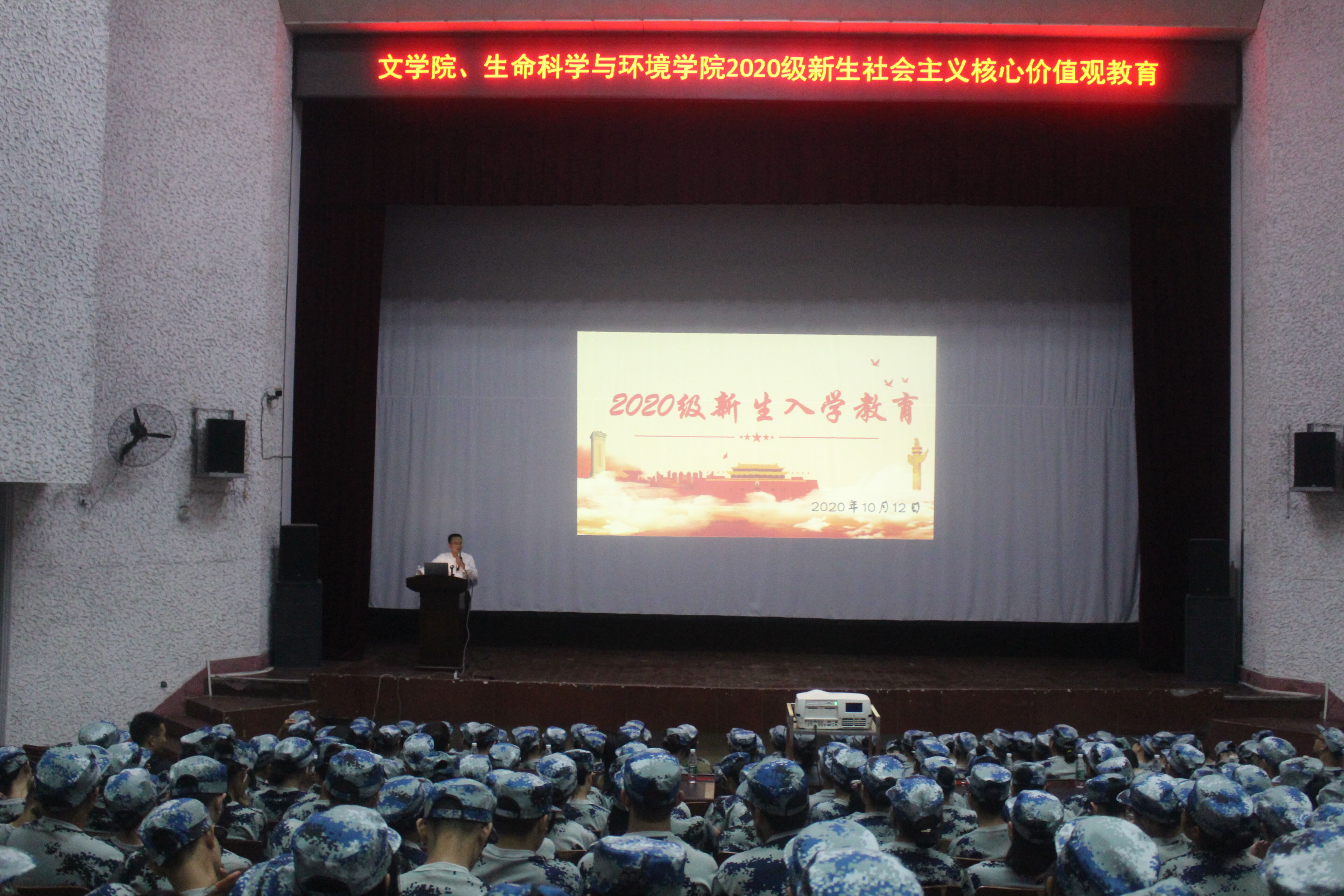 为增强学生对社会主义核心价值观的理解,加强学生思想道德建设,买球官网与文学院于10月12日晚七点在排演厅展开了2020级新生社会主义核心价值观教育,买球官网党总支书记彭晖、党总支副书记蒋湘祁、文学院党总支书记张云峰、党总支副书记何颖,以及双方学院的辅导员老师莅临本次会议。会议由彭晖书记主持,学生工作处处长蒋杰为主讲人。