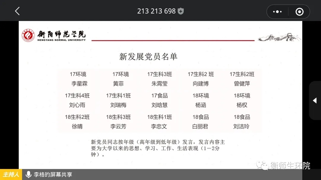 会议伊始,学生党支部书记许若霏宣读接收预备党员名单。本次新发展预备党员包括李星霖、黄菲、朱霄莹、向建博、曾健萍、刘心雨、刘瑞梅、刘晗慧、杨涵、杨权、李云芳、李忠文、白丽君、刘洁玲在内的17、18级共十五名同志。