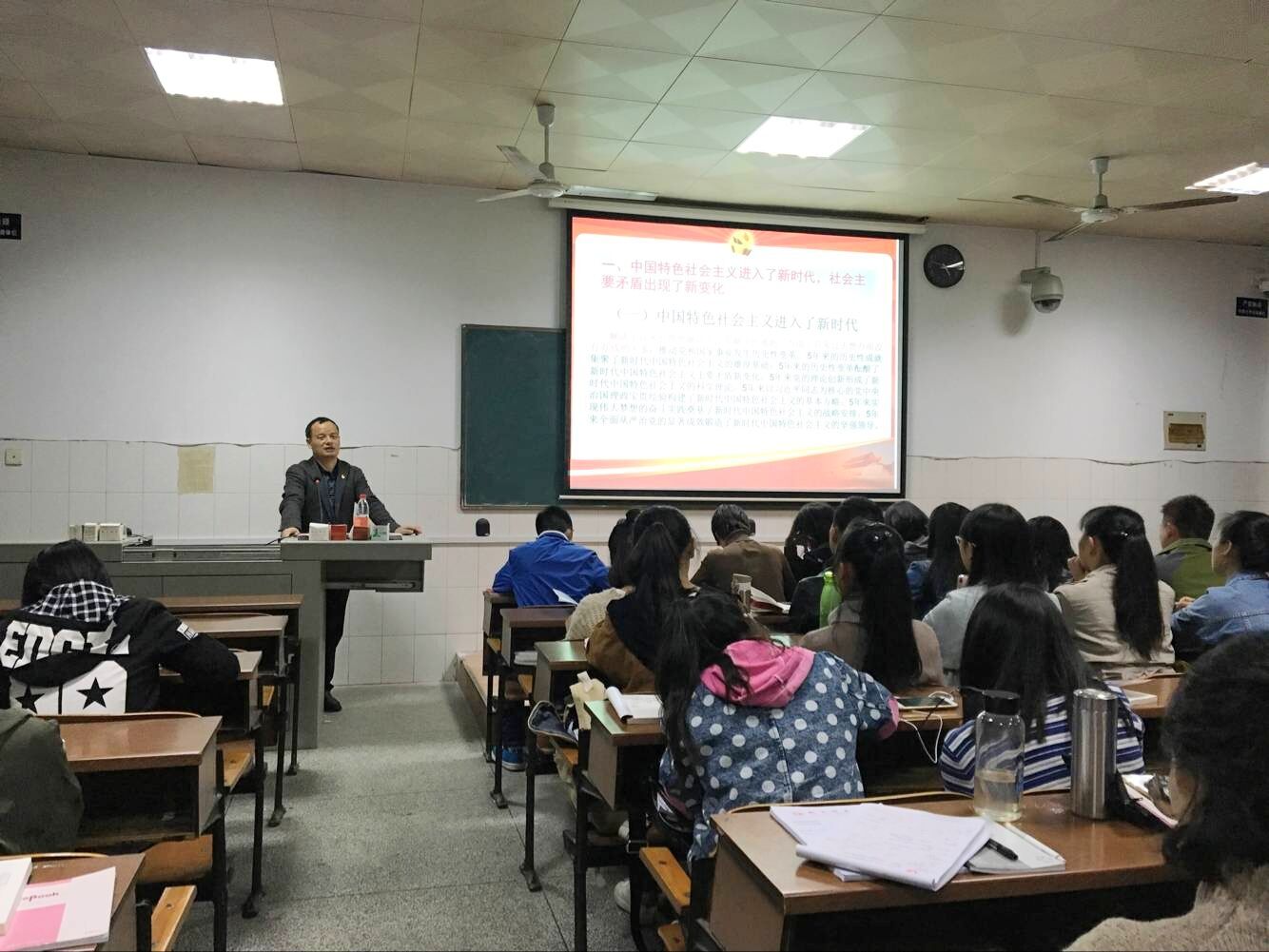 陈敏副校长从五个方面讲授本次党课。首先从“中国社会主义进入新时代,社会主义矛盾出现了新变化”引入。陈校长表示,中国特色社会主义解决了许多长期想解决而没有解决的难题,推动党和国家事业发生历史性变革;中国特色社会主义进入了新时代,意味着近代以来久经磨难的中华民族迎来了从站起来、富起来到强起来的伟大飞跃,迎来了实现中华民族伟大复兴的光明前景;我国社会主要矛盾已经转化为人民日益增长的美好生活需要和不平衡不充分的发展之间的矛盾。二是提到“新时代中国共产党新的历史使命,是实现中华民族伟大复兴”。陈校长说到:实现伟大梦想必须进行伟大斗争、必须建设伟大工程、必须推进伟大事业,今天的我们,比历史上任何时期都更接近、更有信心和能力实现中华民族伟大复兴的目标。三是引入“习近平新时代中国特色社会主义思想是全党全国人民为实现中华民族伟大复兴而奋斗的行动指南”。陈校长反复强调,正是“新思想”,开辟了中国特色社会主义“新时代”,在理论与实际结合的基础上发展我们面对的“新使命”,不仅为成为中华民族“强起来”的有力注解,也为世界提供着中国智慧和中国方案。四是号召“沿着新征程,夺取新时代中国特色社会主义伟大胜利”。陈校长指出,凝聚着新思想、新使命的十九大的新征程,贯穿于我们的整个时代,需要我们所有的人一起努力。五是强调“坚定理想信念,志存高远,脚踏实地,勇做时代的弄潮儿”。陈校长指出,要做一名顺应时代的发展者,就要坚定信念,做有理想的好学生,刻苦学习,做有本领的好学生,牢记使命,做有担当的好青年。