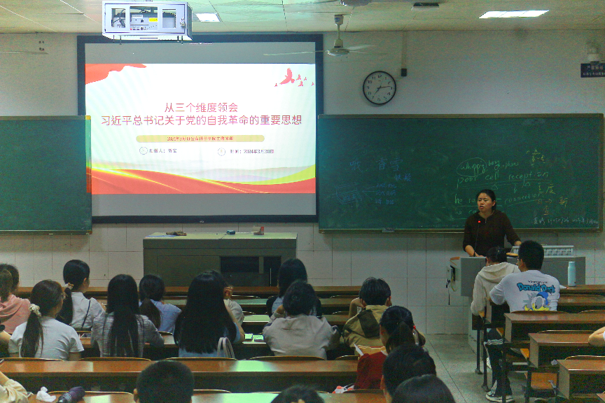 为深入学习贯彻习近平总书记关于党的自我革命的重要思想,提高买球官网学生党员的思想觉悟,充分发挥党员的先锋模范作用,2024年3月30日晚,买球官网学生党支部在行知楼201开展了“从三个维度领会习近平总书记关于党的自我革命的重要思想”的主题党课学习,贺宏同志为本次党课宣讲人,学生党支部书记付蓉和买球官方网站全体党员同志参加。
