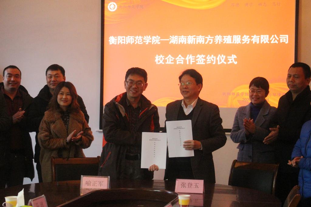 2020年1月3日下午,买球官方网站与湖南新南方养殖服务有限公司战略合作协议签署仪式在生命科学与环境学院会议室隆重举行。我校副校长张登玉教授代表学校与湖南新南方养殖服务有限公司董事长喻正军博士共同签署了校企战略合作协议,并交换了协议文本。双方在人才培养、奖学金设立、就业实习、创新创业班建设和科学研究等方面达成全面合作意向。
