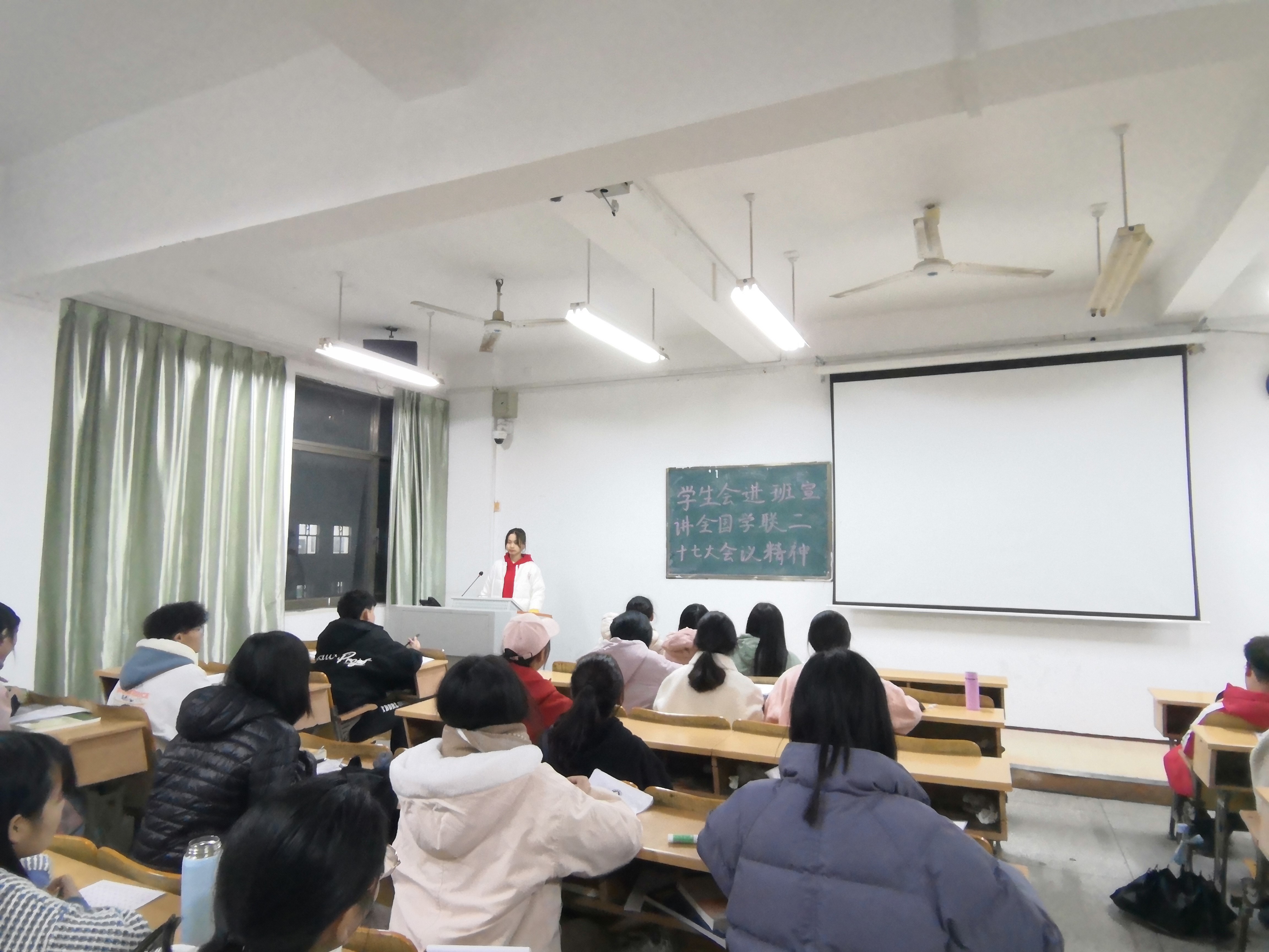 为深入学习贯彻全国学联二十七大、习近平总书记贺信和党中央致词精神,进一步凝心聚力、拼搏奋进,不断推进我校学生会组织深化改革,11月24日晚19:00,买球官网学生会成员进班宣讲学联二十七大会议精神,19、20级全体同学参与此次学习。